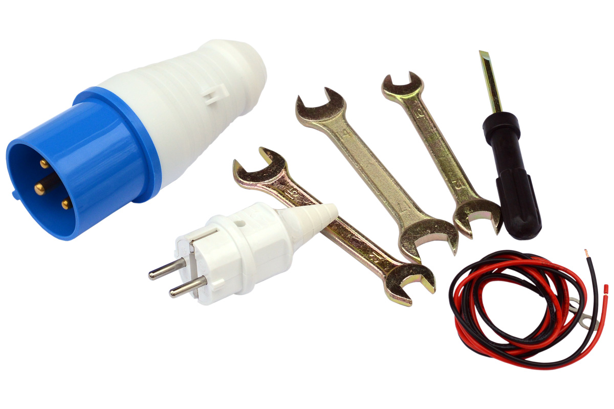 | Комплектация | Электрическая вилка, разъем для АВР, комплект проводов, ручки и колёса, блок АВР |