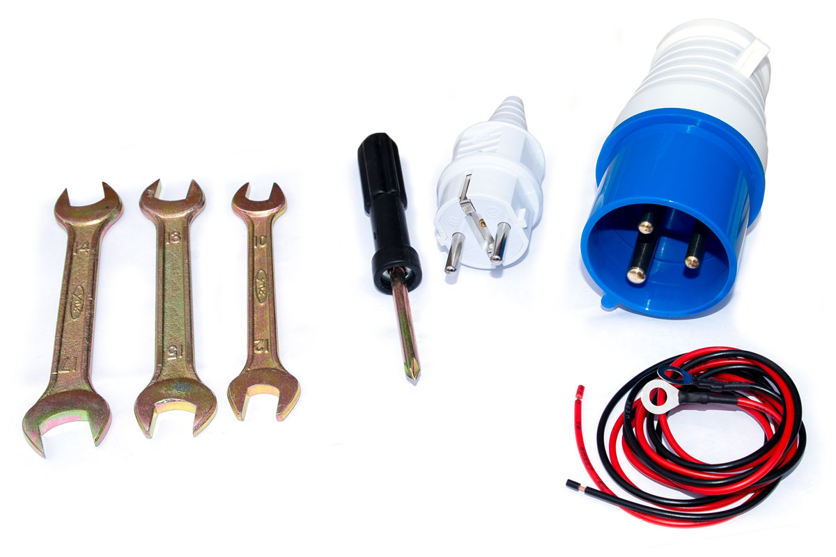 | Комплектация | Электрическая вилка, разъем для АВР, предпусковой подогреватель, комплект проводов, колёса |